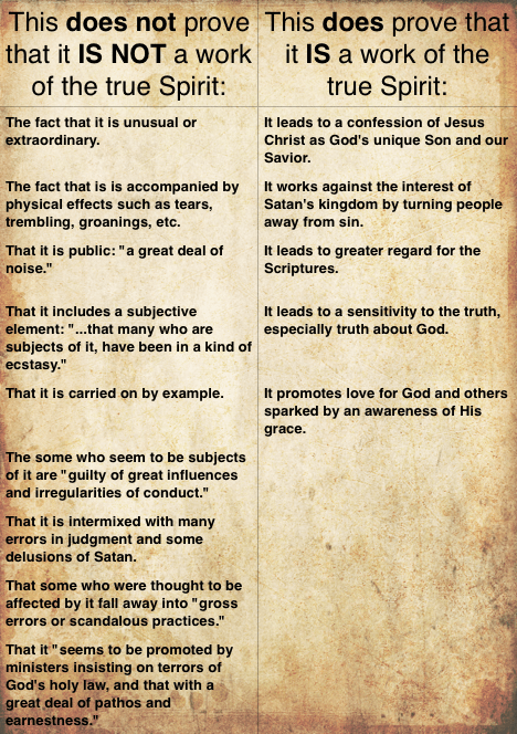 Joe Thorn reminded me of this comparison I gave my students some years ago based on Jonathan Edwards Marks of a Work of the True Spirit. It was at a time when there was some controversy about a revival that had touched several college campuses. Students at my school were anxious because it appeared as if the Holy Spirit had passed over us. When “revival” did come, some questioned whether it was genuine.